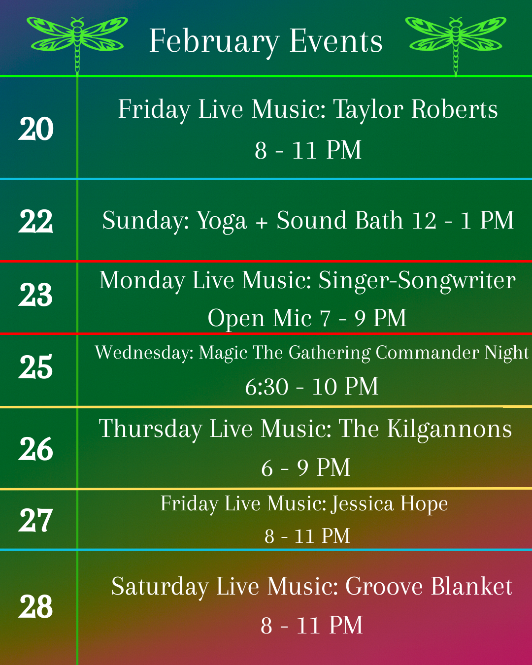 Dragonfly Lounge is your destination for relaxation, connection, and wellness. Our unique cannabis lounge offers a welcoming atmosphere where you can unwind and enjoy thoughtfully crafted mocktails and traditional kava, and kratom teas. We take pride in curating premium cannabis and wellness products to elevate your experience, whether you’re looking to relax, socialize, or explore holistic alternatives. At Dragonfly Lounge, every sip and every product is designed to help you find your balance.